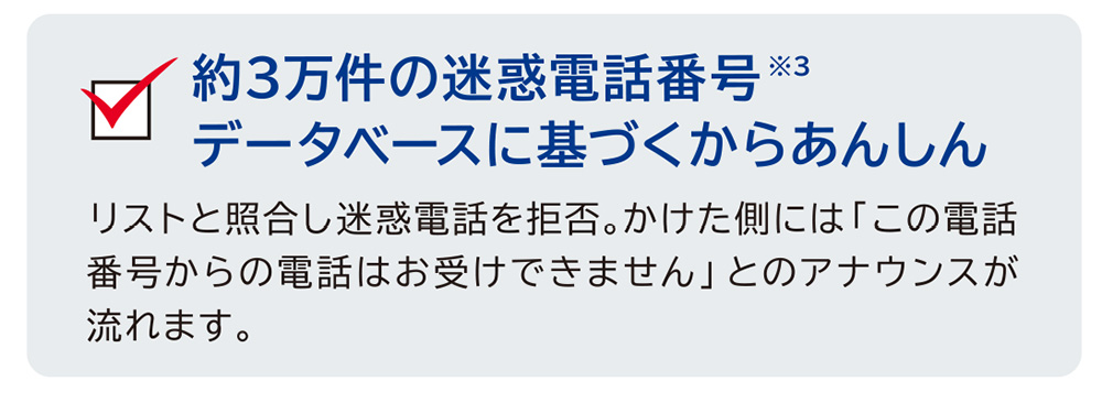 ※1:トビラシステムズ社の迷惑電話番号リストは、警察・自治体・契約者から提供されるデータを活用して作成されています。※2:トビラシステムズ社調べ(2024年1月~12月時点の固定電話向けおよびモバイル向けサービスからの統計値)。※3:迷惑電話番号とは、トビラシステムズ社の迷惑電話番号リストに蓄積されている電話番号(警察提供の番号、利用者の拒否登録番号、トビラシステムズ社独自調査番号)