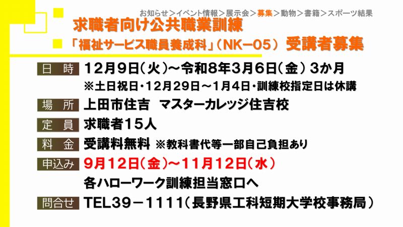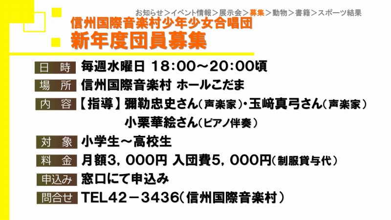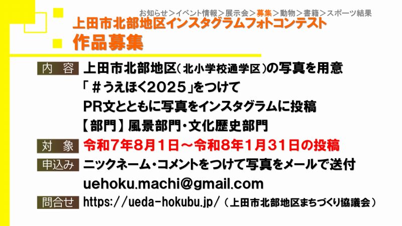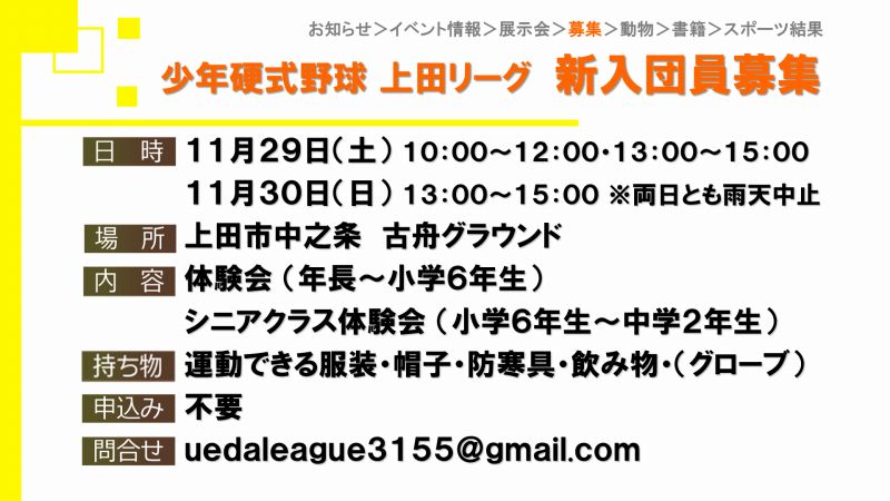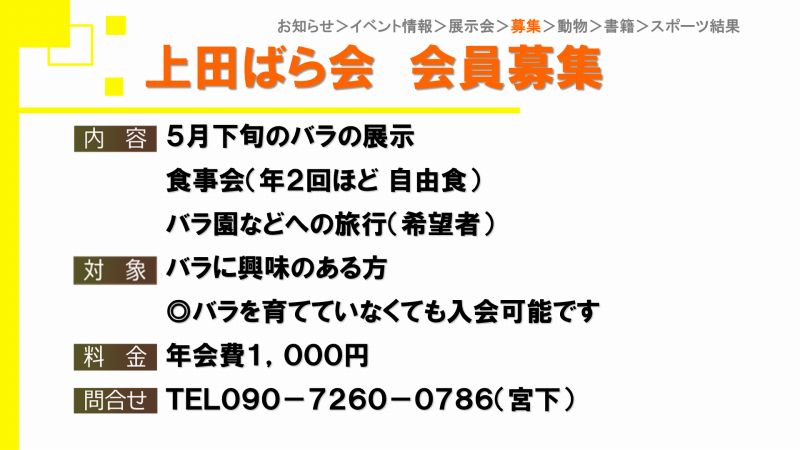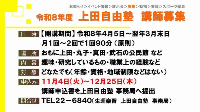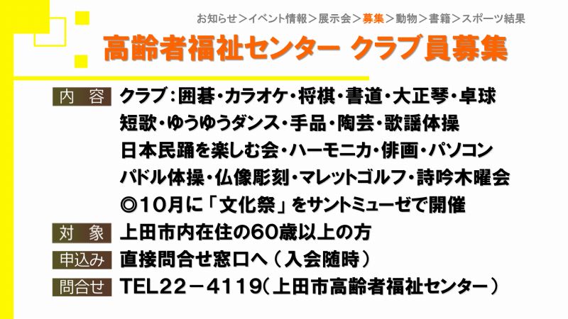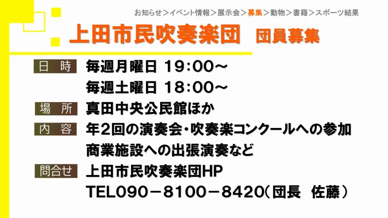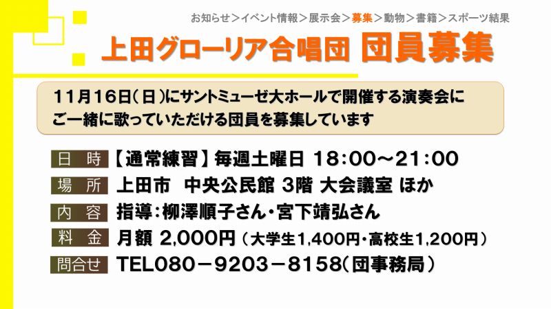 UCV募集情報掲示板は上田市、東御市、真田町、坂城町、青木村のサークル・教室・講座などの募集情報です。