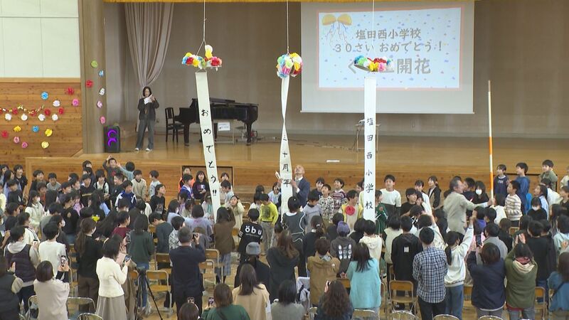 式典のテーマは「塩田西小学校の30歳のお誕生日をお祝いする」。くす玉割りや「未成年の主張」など、手作りの温かな会となりました。