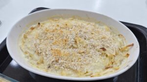 ③グラタン皿にバターを塗り、②の半量を広げる。その上にアンチョビをちぎってのせてから、残りの②を広げる。①の生クリームと牛乳をそそぎ、上にパン粉とちぎったバターをのせ、200℃のオーブンで20分焼く。