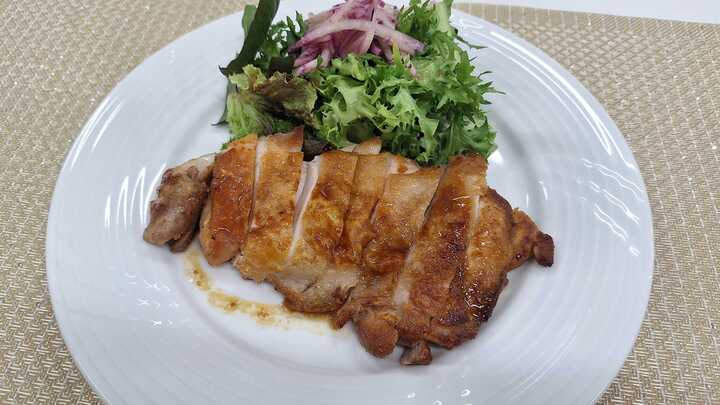 ④ 皮に焼き色がついたら、オーブンシートを取り外し、裏返して鶏肉に火が通るまで焼いていく。焼けたらバット等に取り出す。